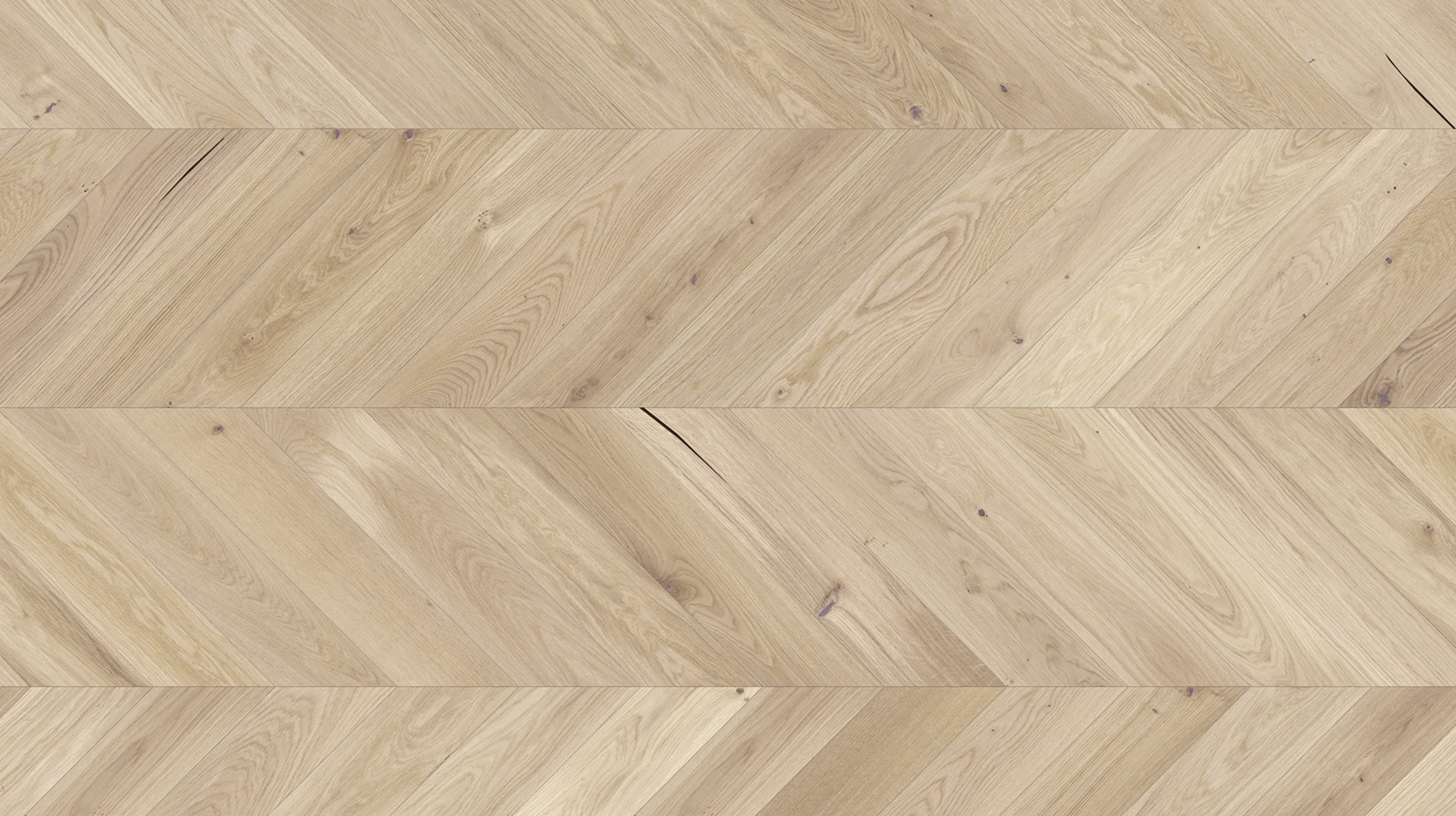 Suelo de roble en un delicado color blanco. El suelo es fino y delicado gracias a su microbisel de cuatro lados, y el exclusivo diseño de la madera se realza mediante el cepillado. Está recubierto con aceite natural. Medida de 725x130x14mm